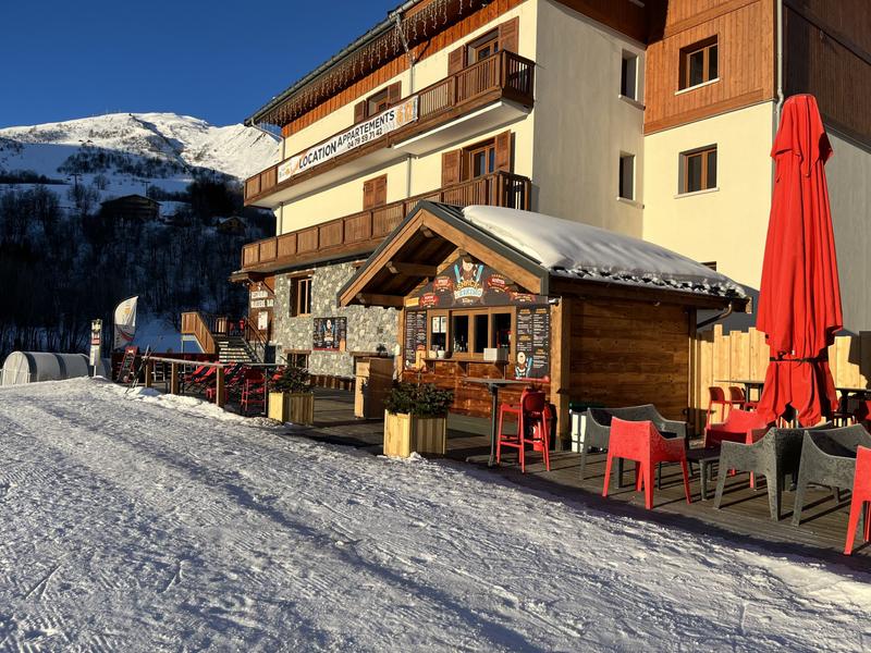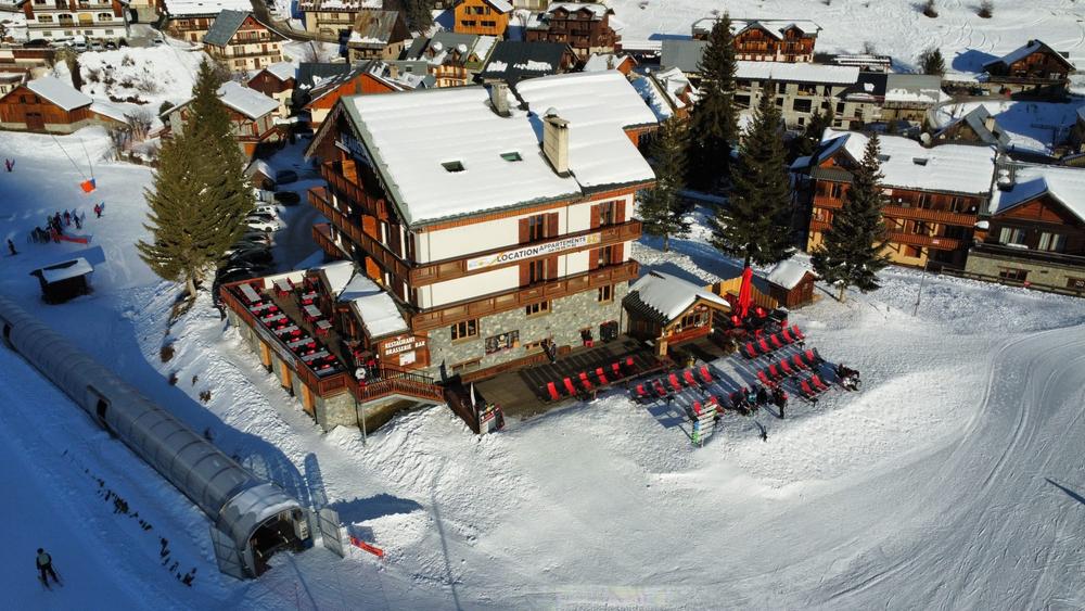 Restaurant, bar et snack avec 2 terrasses, vue panoramique, plein sud, situés sur le front de neige à côté du rassemblement ESF.