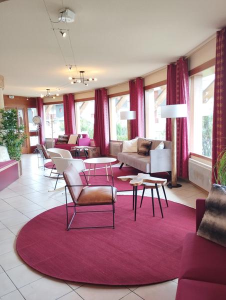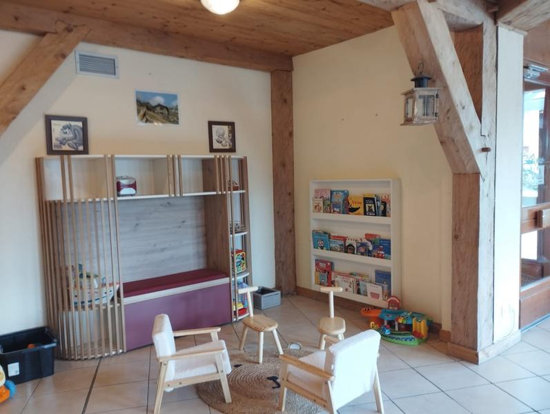 Salon d'accueil avec un espace dédié aux enfants (jeux et coloriages).